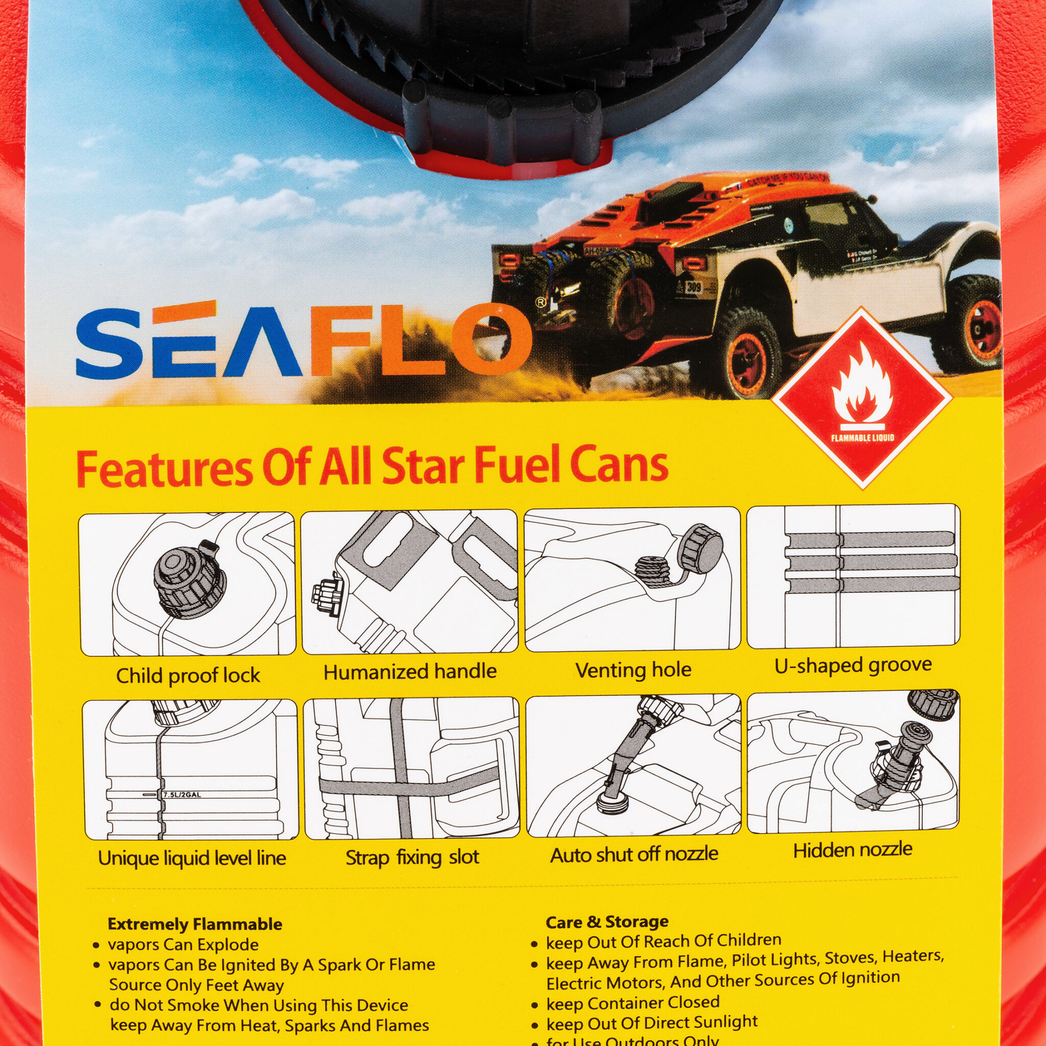 Перевагиблокування від дітей, вентиляційний отвір, вертикальна лінія для визначення рівня палива, кришка з фіксатором, лійка з системою запобігання переливу, пилозахисний ковпачок